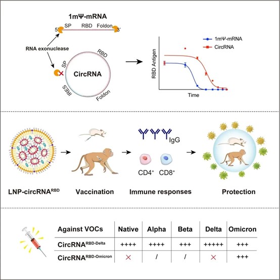 以上結(jié)果表明,針對新冠病毒德爾塔變異株設(shè)計的circRNARBD-Delta疫苗是具有廣譜保護(hù)力的新冠肺炎候選疫苗,該研究也為針對當(dāng)前新冠變異株迅速傳播的疫苗研發(fā)和接種策略提供了參考依據(jù)。同時,該項(xiàng)平臺型技術(shù)的建立在感染性疾病、自身免疫病、罕見病以及癌癥的預(yù)防或治療中具有廣泛的應(yīng)用前景。