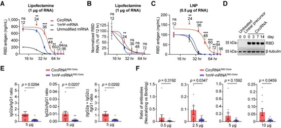 一系列的對比評估表明,與mRNA疫苗相比,circRNA疫苗具有以下特點(diǎn)或優(yōu)勢(圖3):1)circRNA具有更高的穩(wěn)定性,可以在體內(nèi)產(chǎn)生更高水平、更加持久的抗原;2)circRNA疫苗誘導(dǎo)機(jī)體產(chǎn)生的中和抗體比例更高,可以更有效地對抗病毒變異,降低疫苗潛在的抗體依賴增強(qiáng)癥(ADE)副作用;3)circRNA疫苗誘導(dǎo)產(chǎn)生的IgG2/IgG1的比例更高,表明其主要誘導(dǎo)產(chǎn)生Th1型保護(hù)性T細(xì)胞免疫反應(yīng),可以有效降低潛在的疫苗相關(guān)性呼吸道疾?。?/span>VAERD,Vaccine-associated enhanced respiratory diseases)副作用。